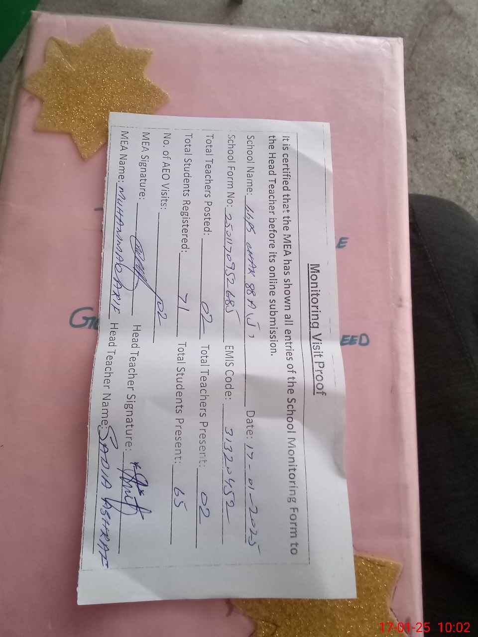 | Attendance Register | Head Teacher | MEA with School | Visit Proof |