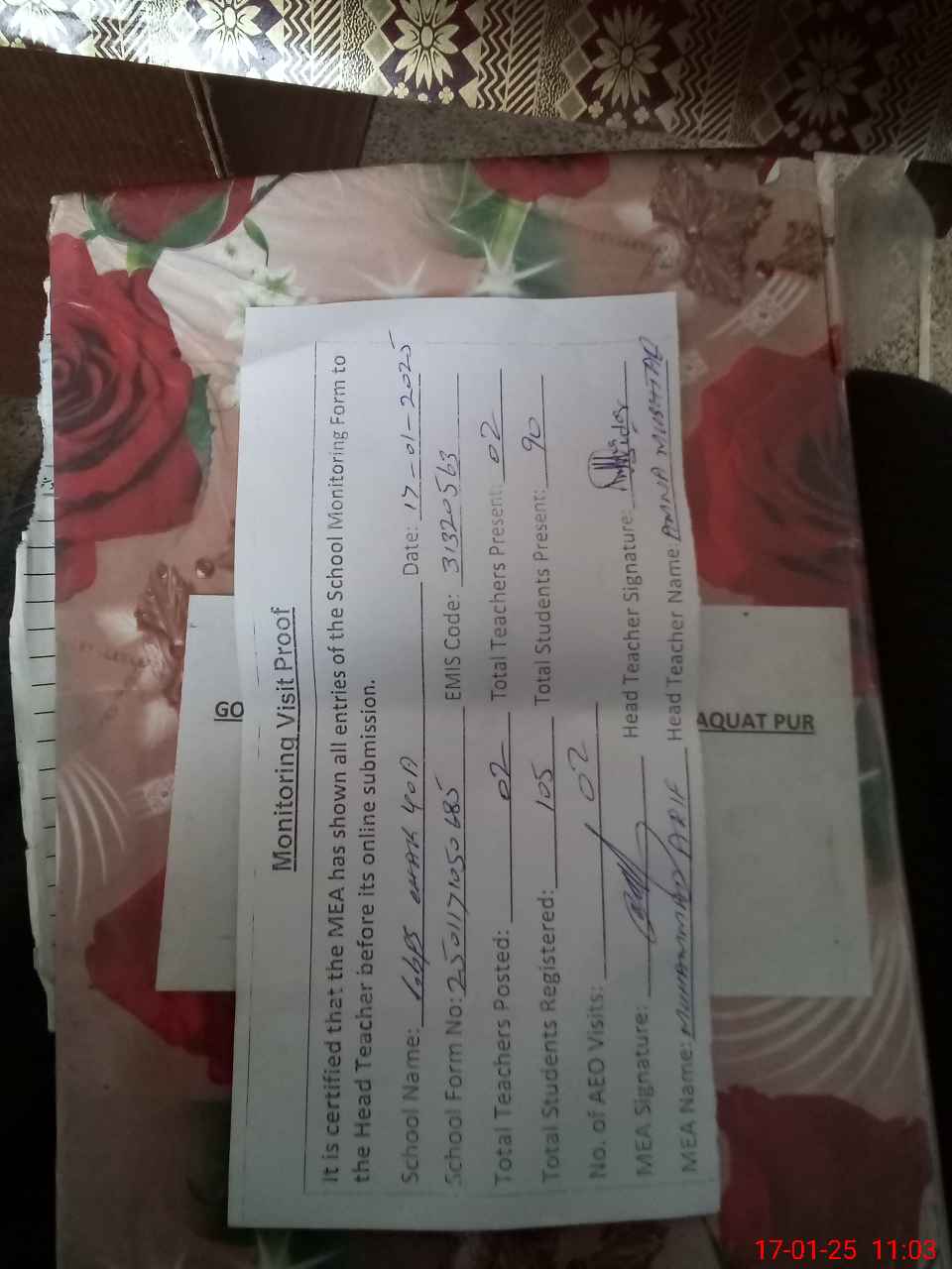 | Attendance Register | Head Teacher | MEA with School | Visit Proof |