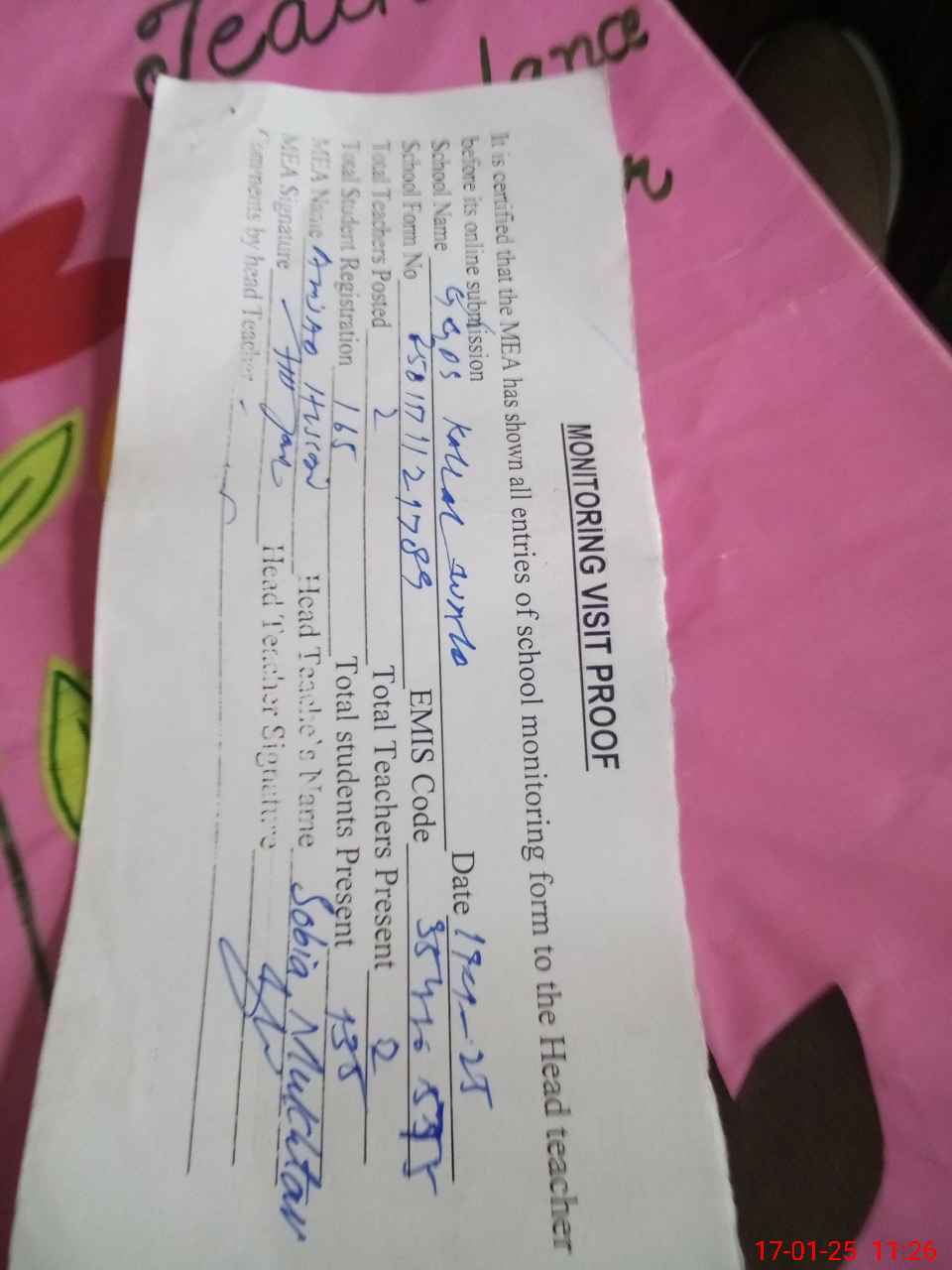 | Attendance Register | Head Teacher | MEA with School | Visit Proof |