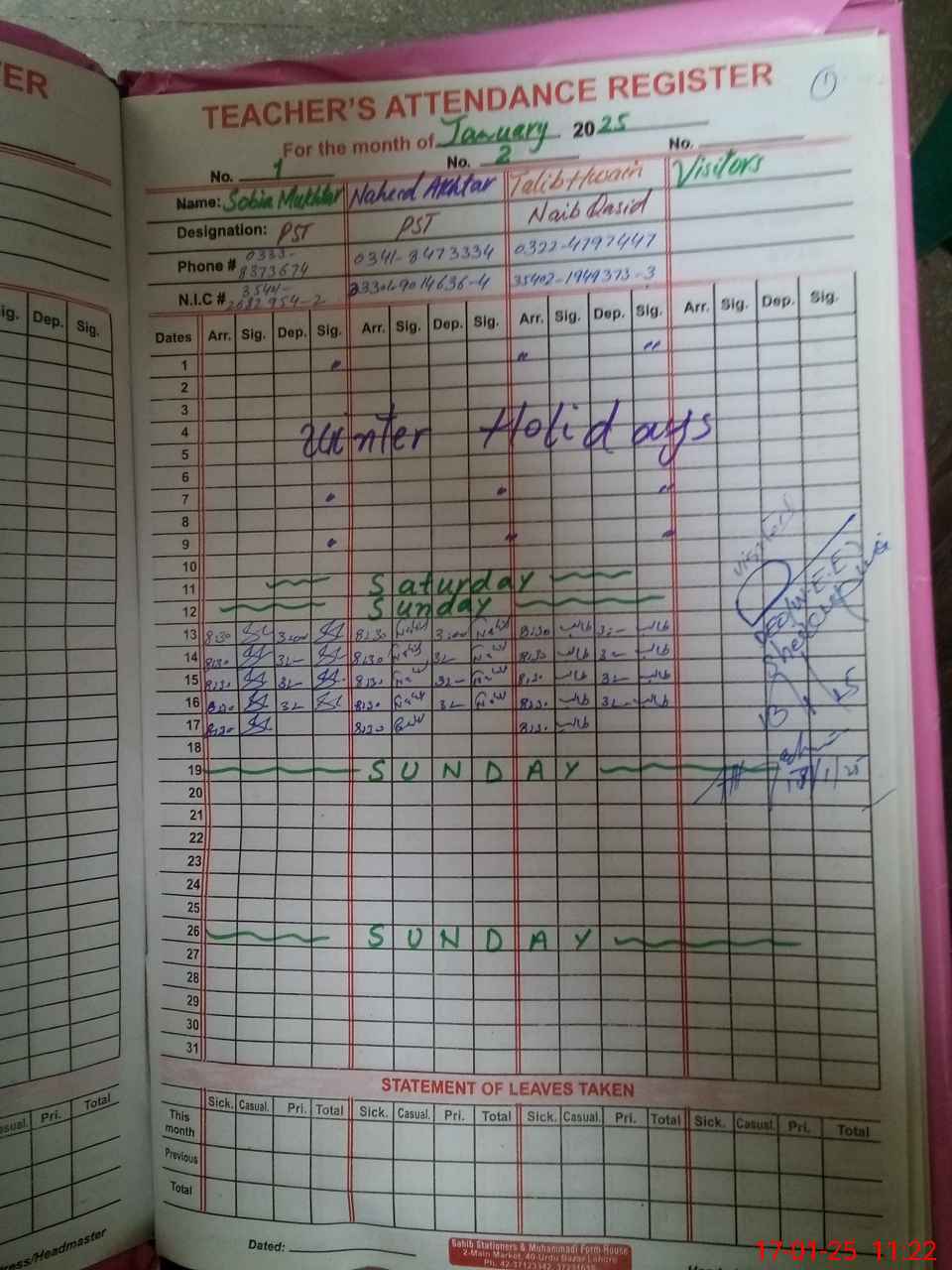 | CNIC | Full Name | Designation | R/C | Absence During Last Calender Month |