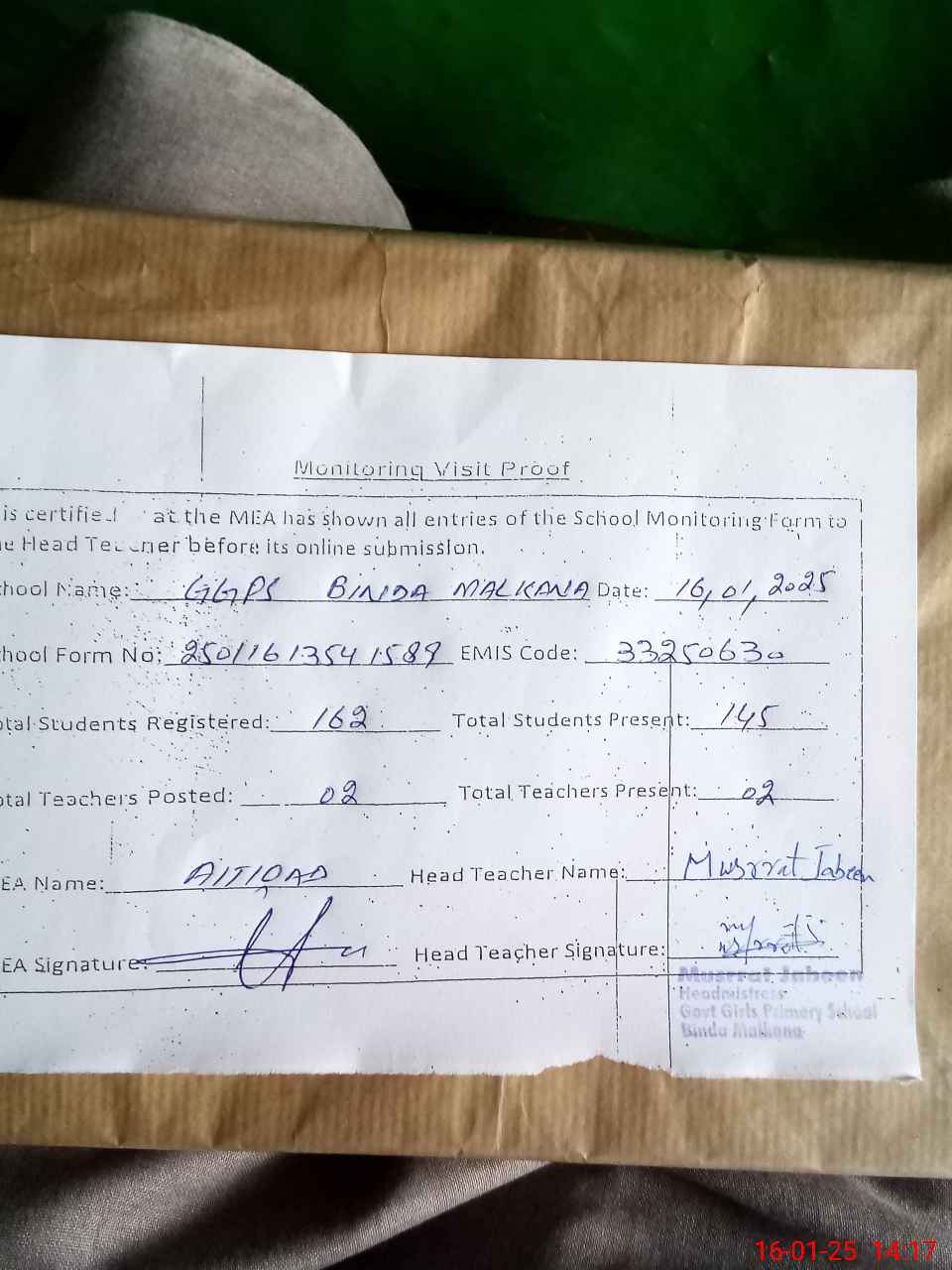 | EMIS Code: 33250630 | Name of School: GGPS BINDA MALKANA | |||