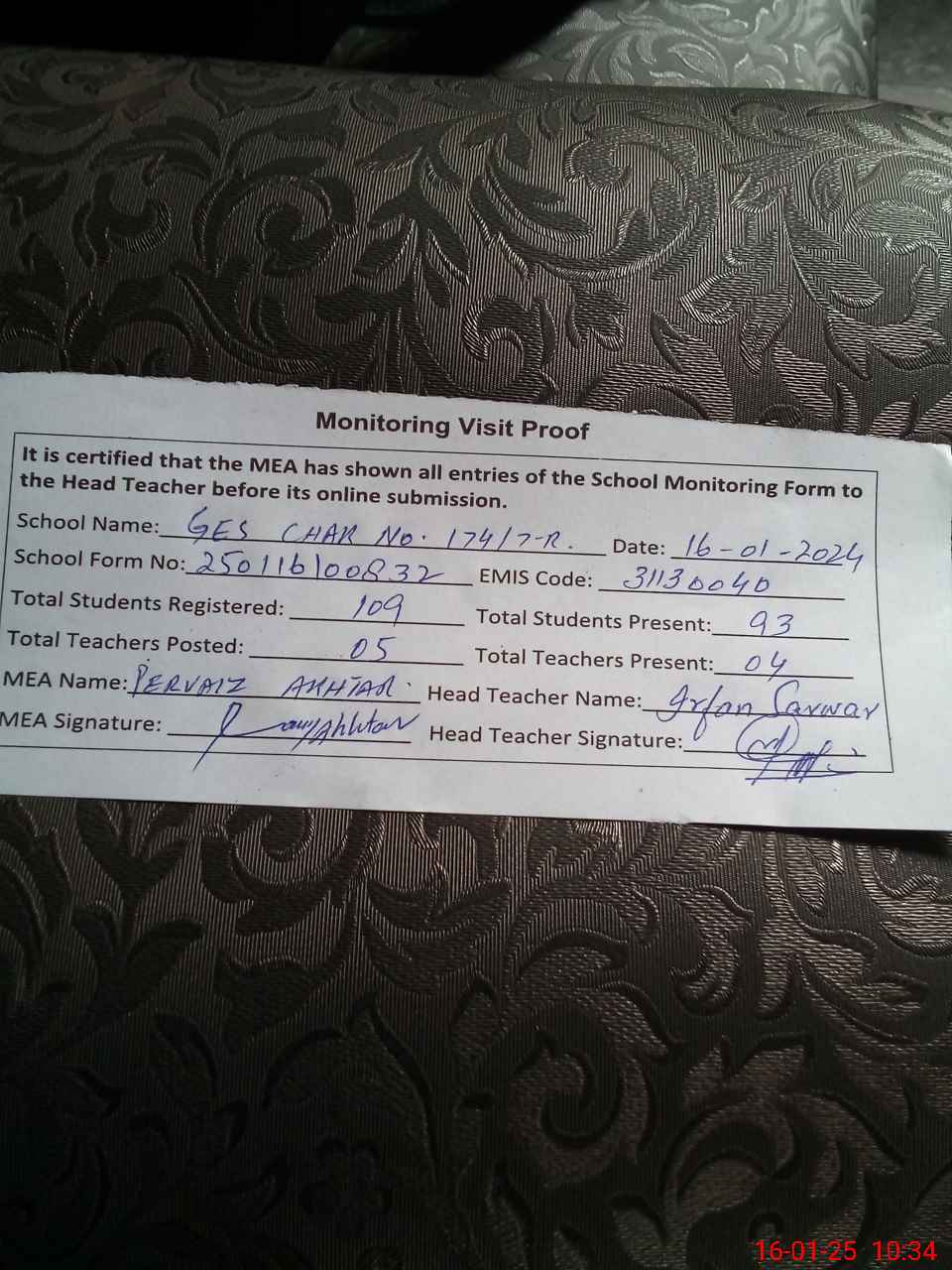| Attendance Register | Head Teacher | MEA with School | Visit Proof |