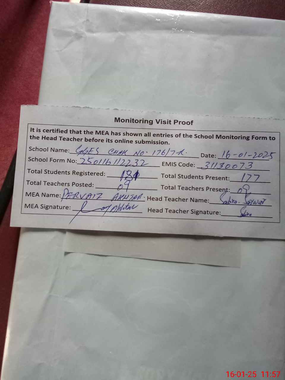 | Attendance Register | Head Teacher | MEA with School | Visit Proof |