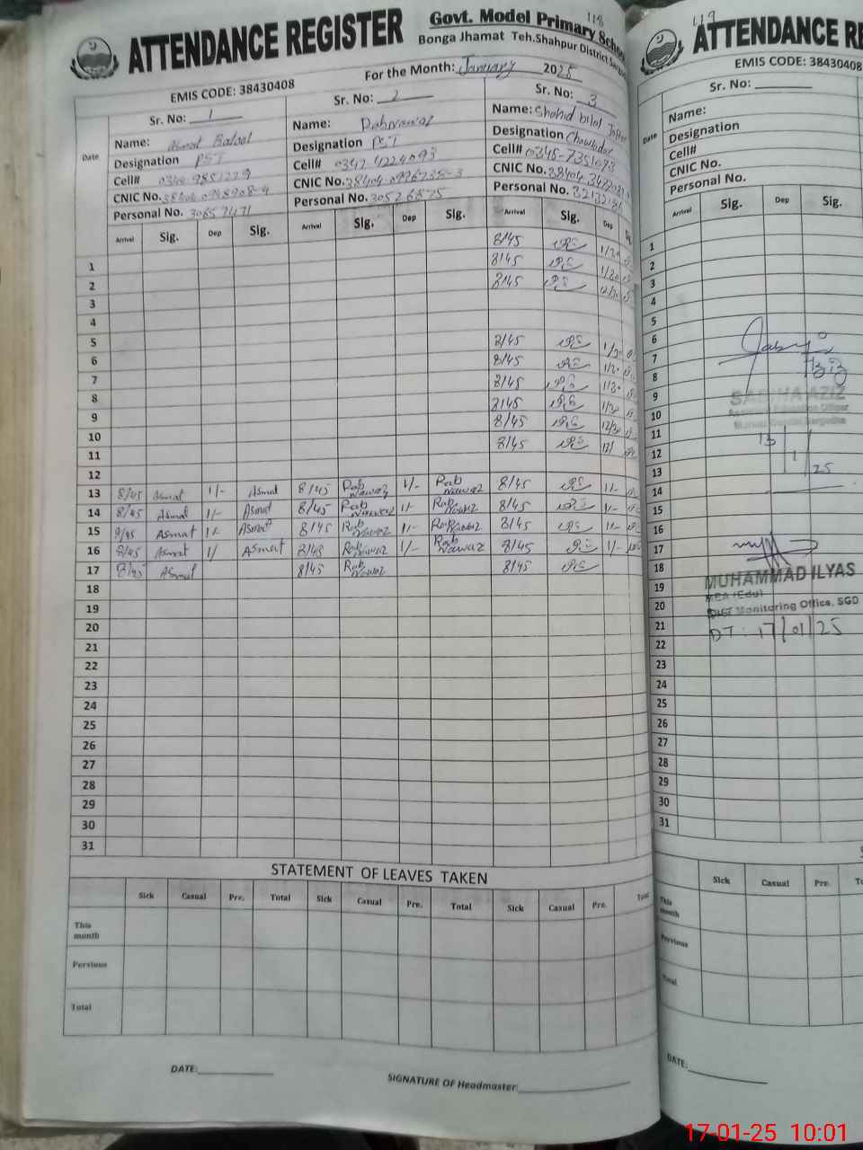 | CNIC | Full Name | Designation | R/C | Absence during last cal. month |