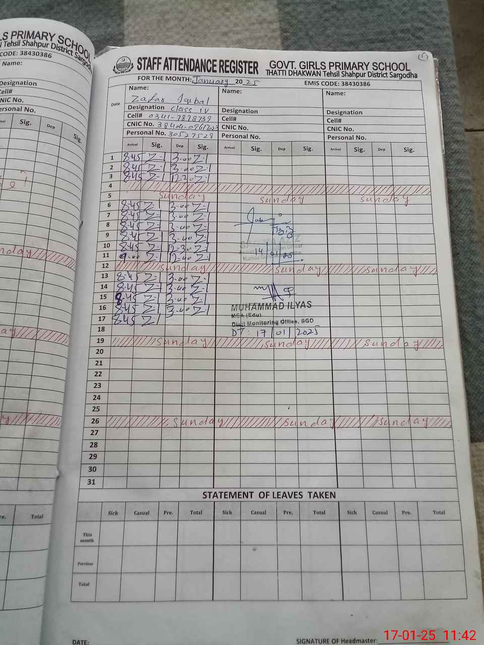 | Name: PA**** AK**** Designation: (School Headmaster's/Headmistress's) PST (Sc-Math) Phone/Cell Number: 03**** |