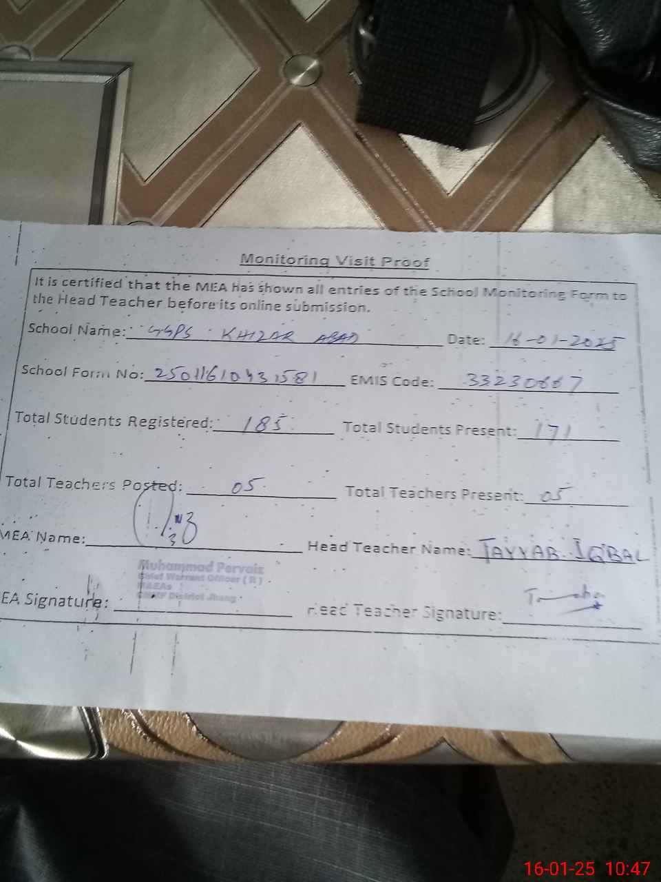 | Attendance Register | Head Teacher | MEA with School | Visit Proof |