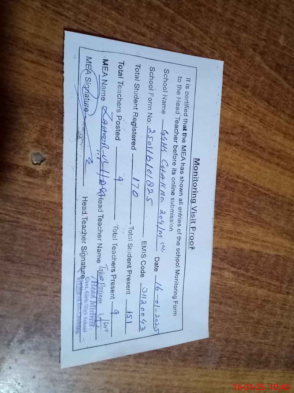 | Attendance Register | Head Teacher | MEA with School | Visit Proof |