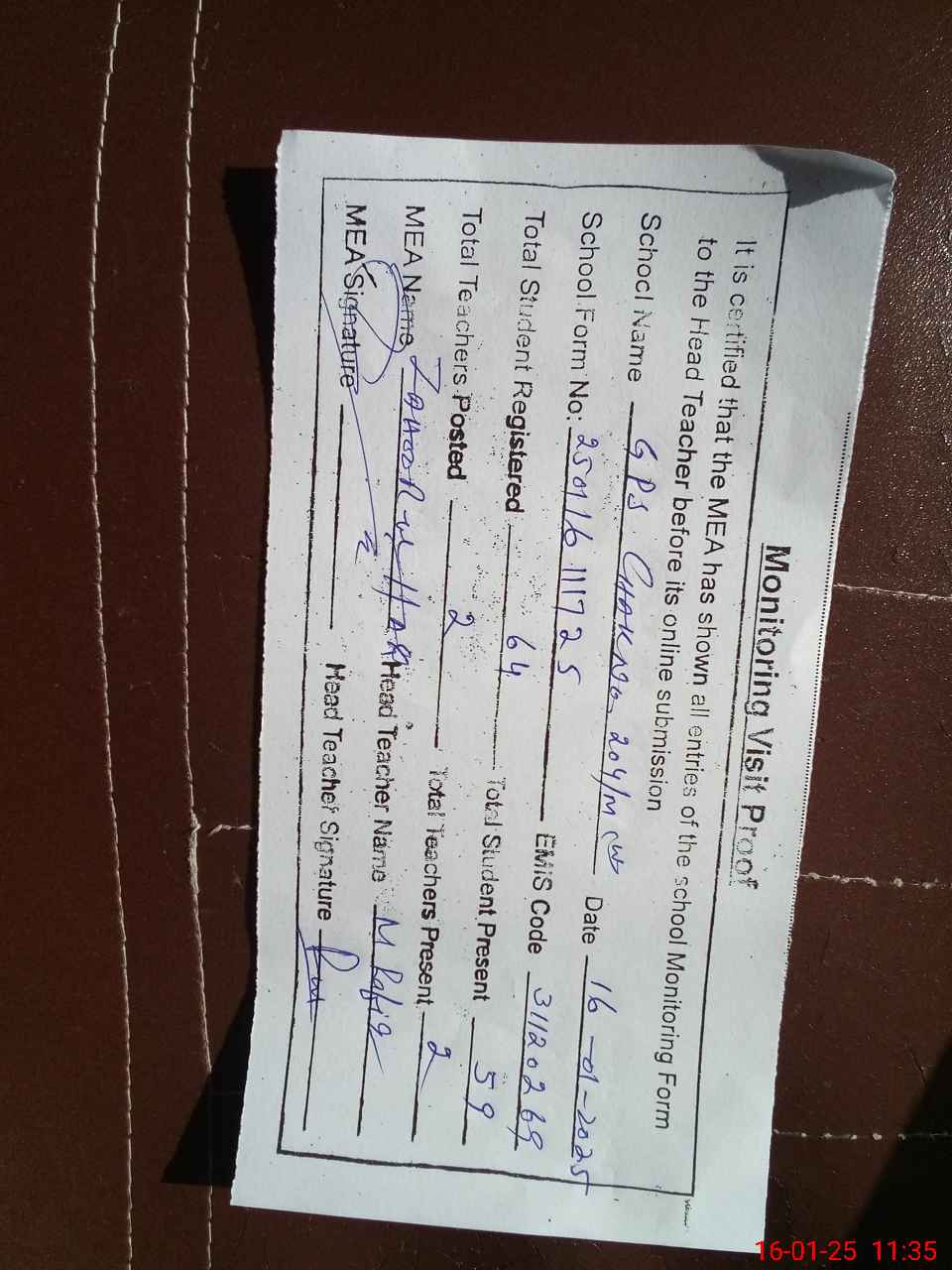 | Attendance Register | Head Teacher | MEA with School | Visit Proof |