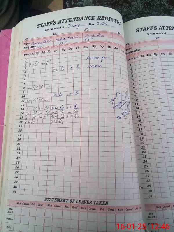 | CNIC | Full Name | Designation | R/C | Absence During Last Calender Month |