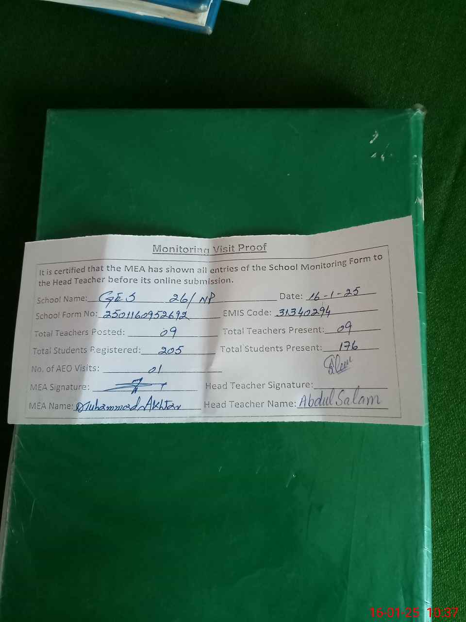 | EMIS Code: 31340294 | Name of School: GES CHAK NO. 26 NP | |||