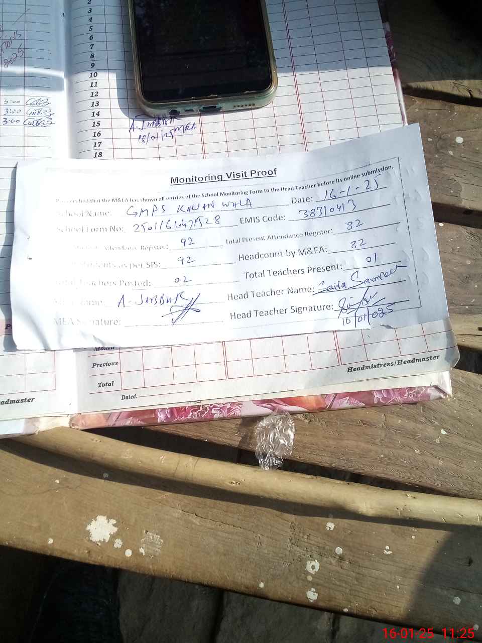 | Attendance Register | Head Teacher | MEA with School | Visit Proof |