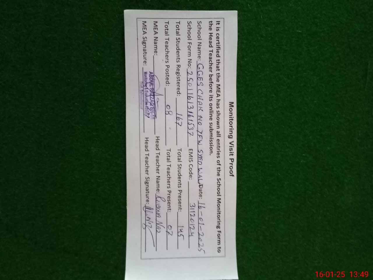 | Certified that this School was Inspected by the Undersigned MEA/DMO Today and the Information Stated Above is as Per Record. | |||||
