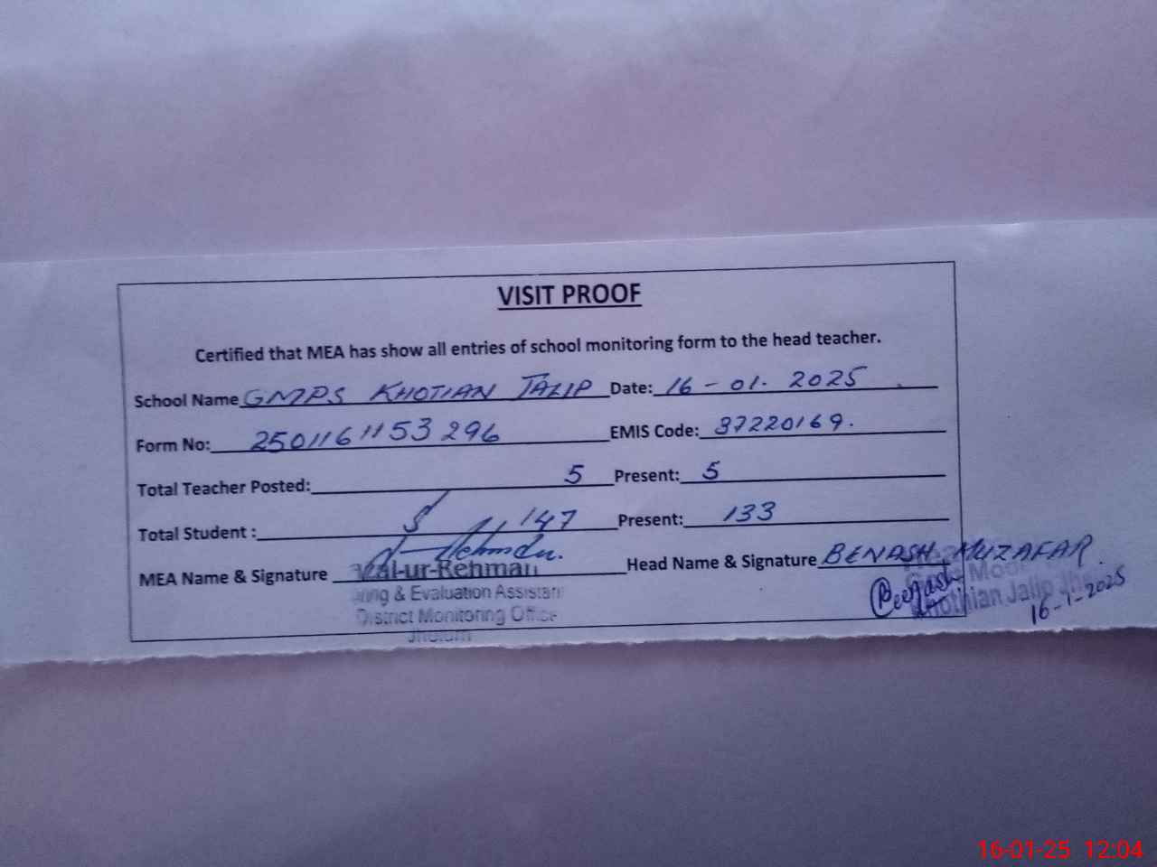 | Attendance Register | Head Teacher | MEA with School | Visit Proof |