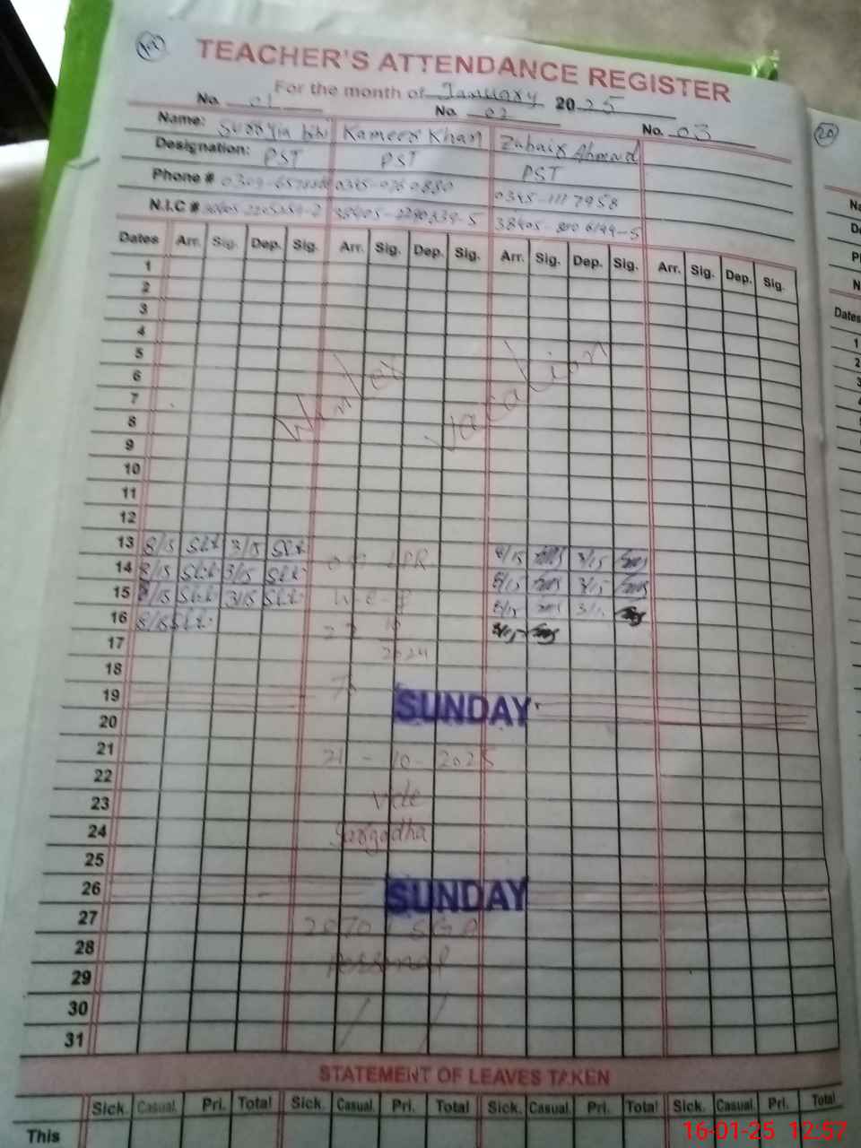 | CNIC | Full Name | Designation | R/C | Absence during last cal. month |