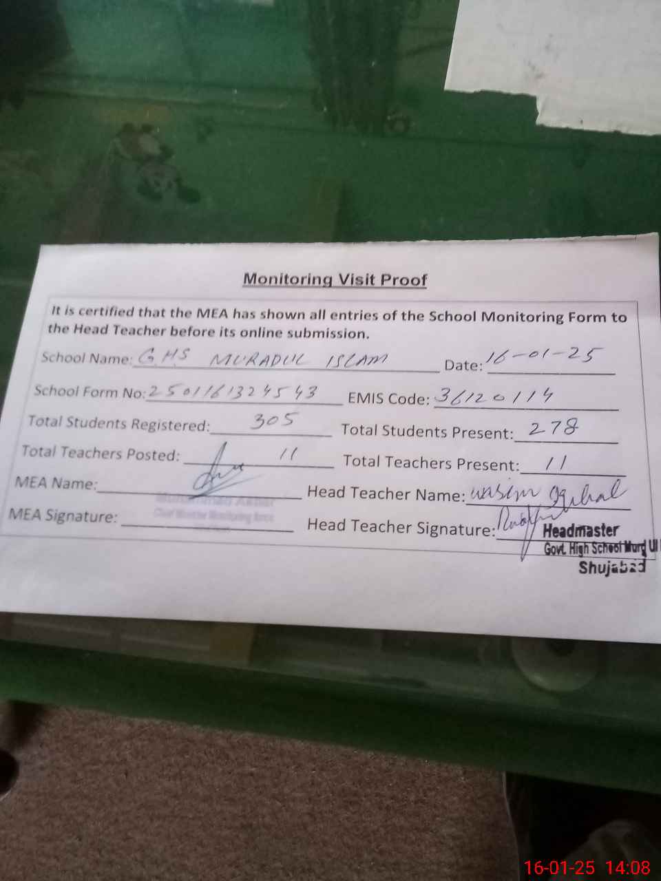 | Attendance Register | Head Teacher | MEA with School | Visit Proof |