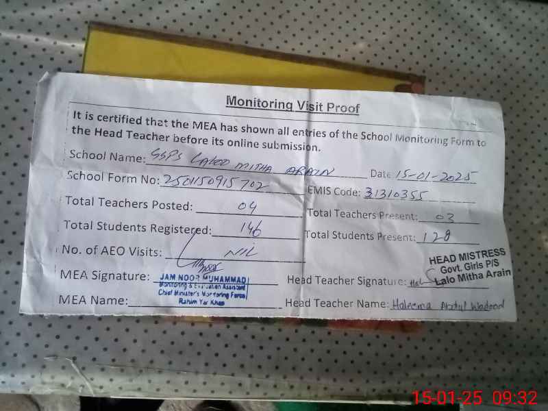 | Certified that this School was Inspected by the Undersigned MEA/DMO Today and the Information Stated Above is as Per Record. | |||||