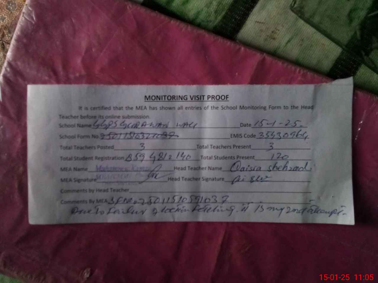 | Attendance Register | Head Teacher | MEA with School | Visit Proof |