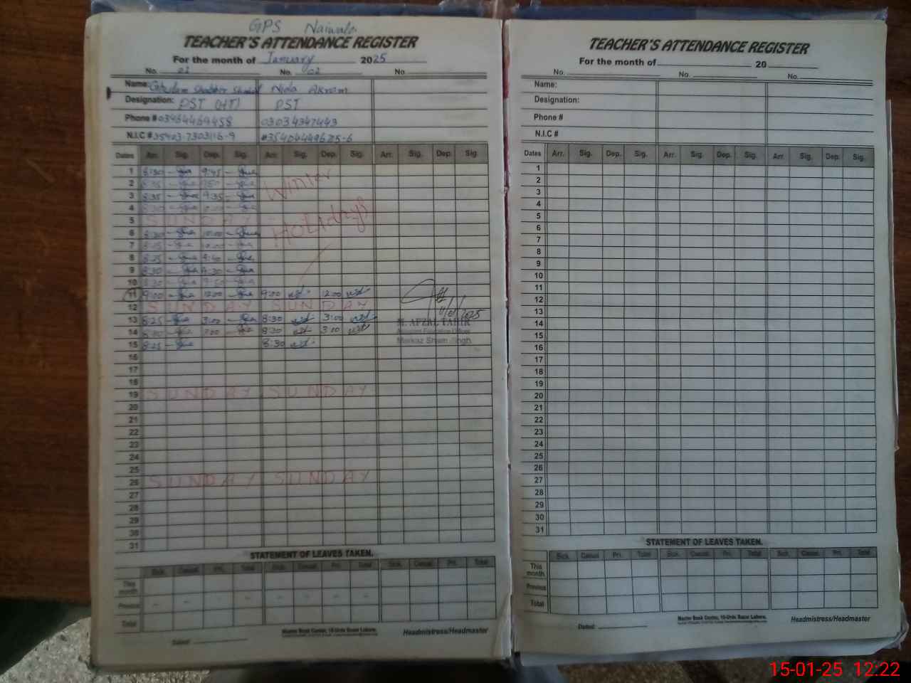 | CNIC | Full Name | Designation | R/C | Absence During Last Calender Month |