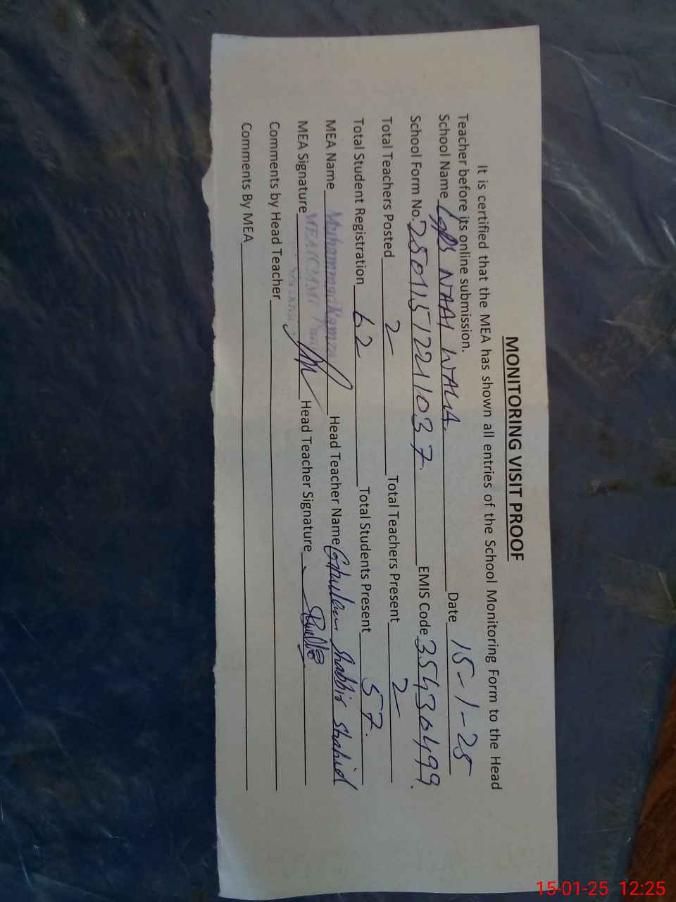 | Attendance Register | Head Teacher | MEA with School | Visit Proof |