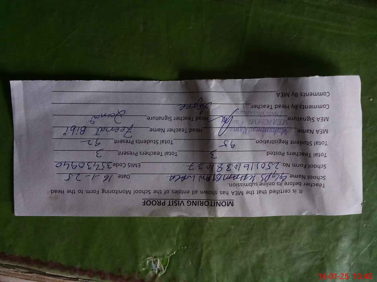 | Attendance Register | Head Teacher | MEA with School | Visit Proof |