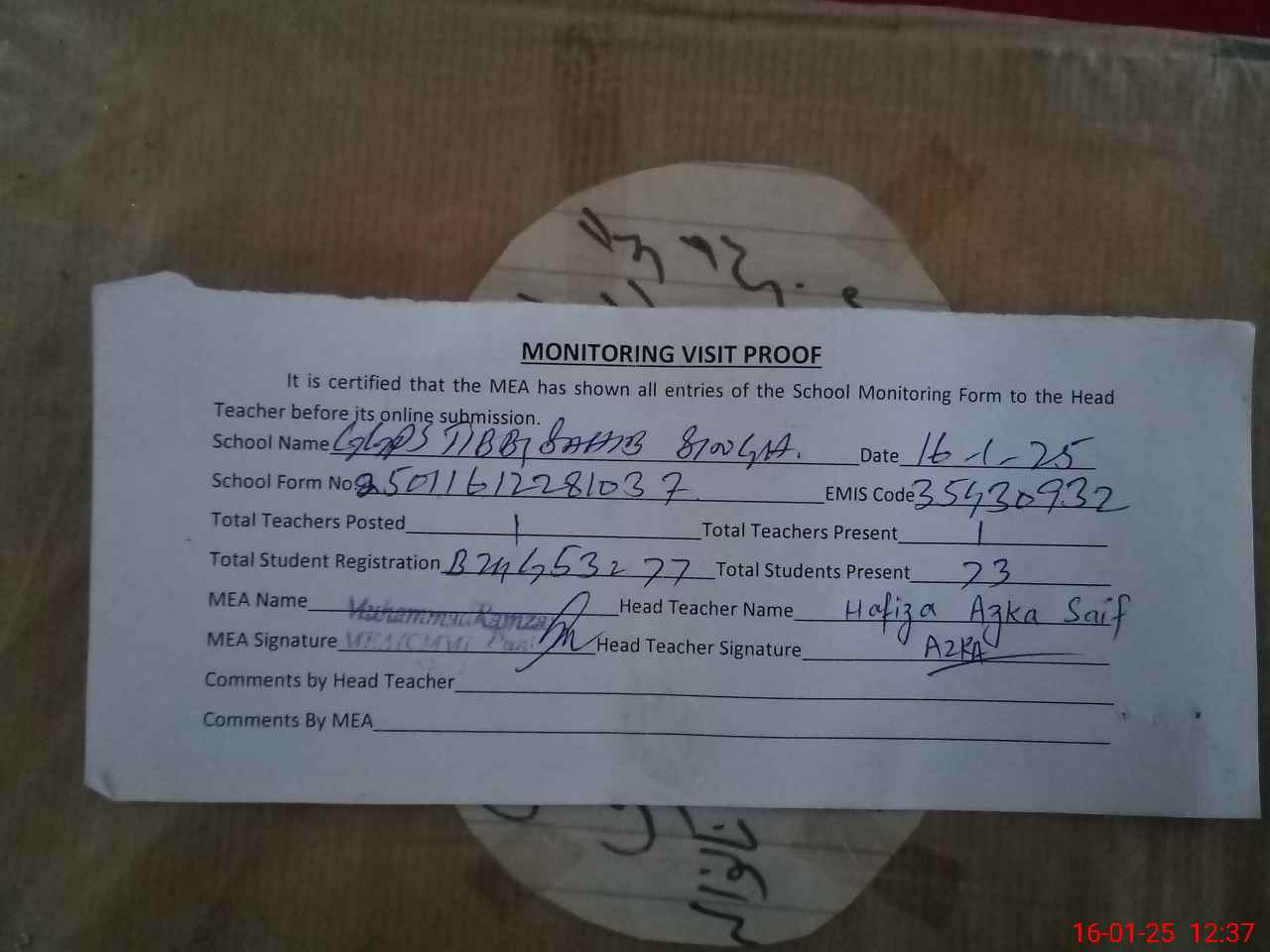 | Attendance Register | Head Teacher | MEA with School | Visit Proof |