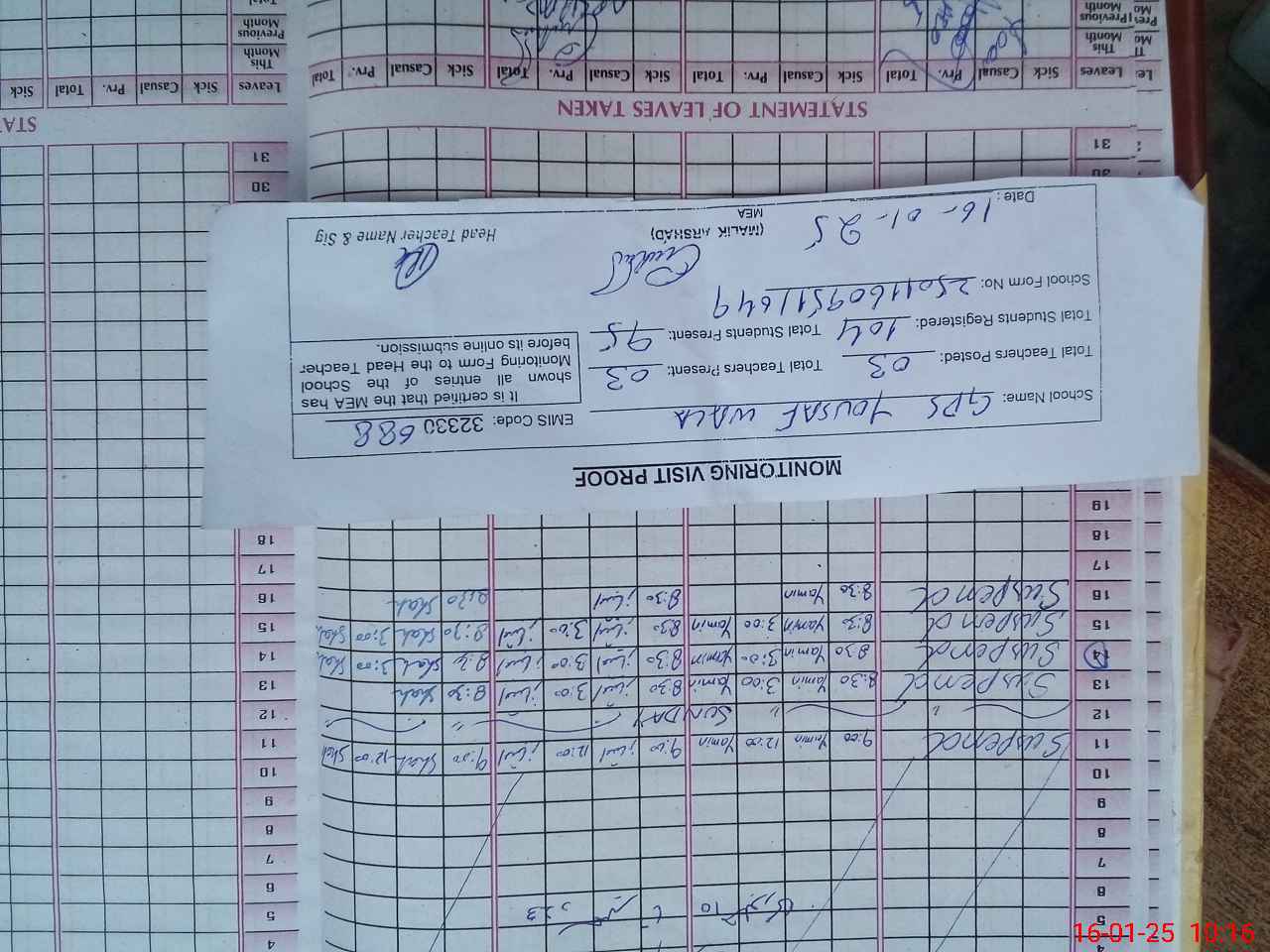 | Attendance Register | Head Teacher | MEA with School | Visit Proof |