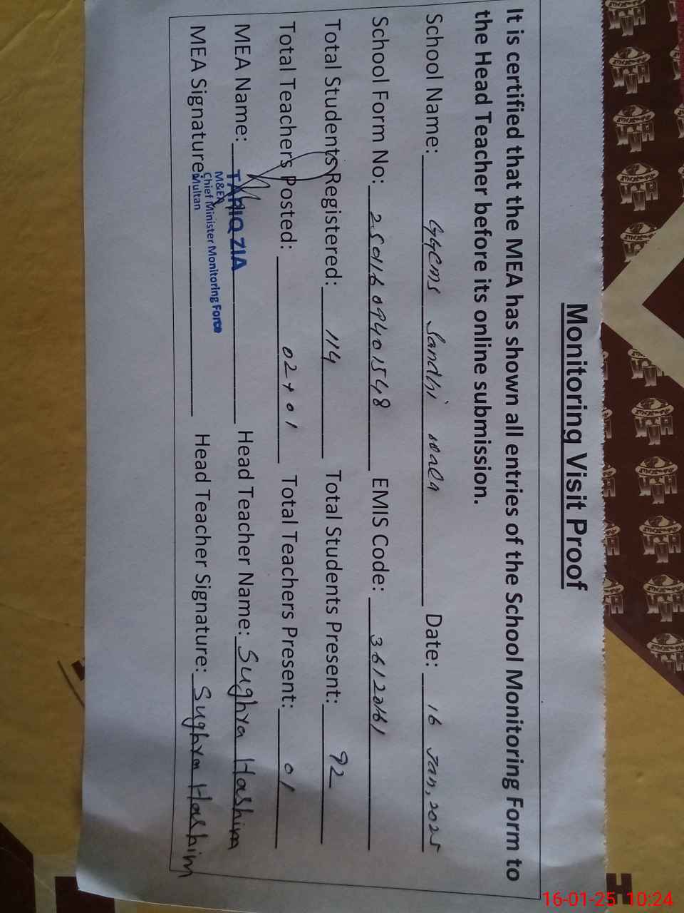 | Attendance Register | Head Teacher | MEA with School | Visit Proof |