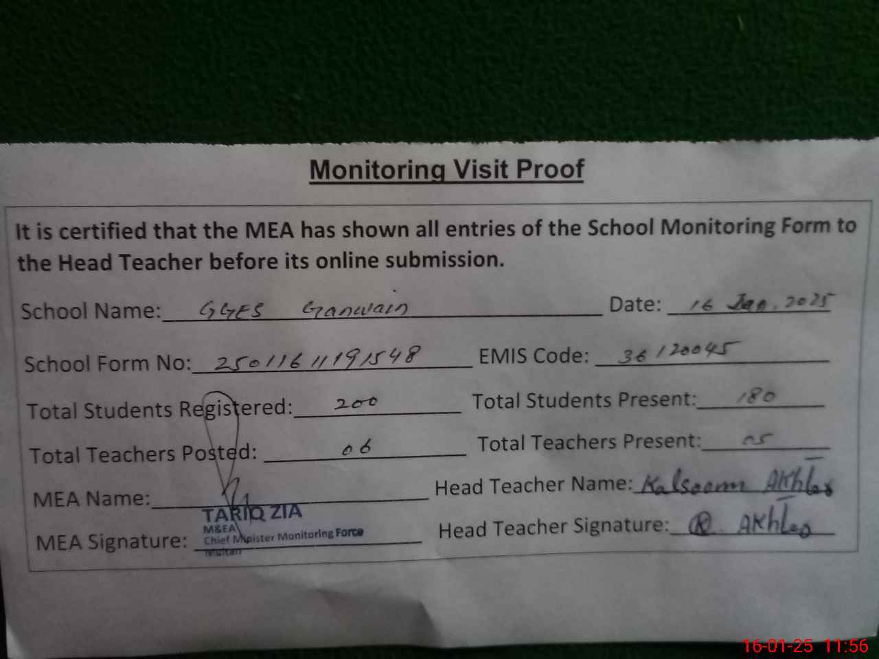 | Attendance Register | Head Teacher | MEA with School | Visit Proof |