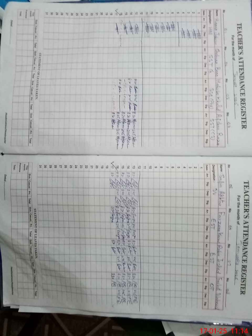 | Remarks (Use Separate Page if Required): MANUAL LEAVE APPLICATIONS ARE AVAILABLE DUE TO SIS HRMS IS NOT WORKING TODAY FORMS D4 FOR DISTRIBUTION OF BOOKS ARE NOT AVAILABLE SHEHNAZ BANO SST GENERAL IS RETIRED ON 10 JANUARY 2025 BUT RETIREMENT NOTIFICATION IS NOT AVAILABLE NSB GRANTS RECORDS ARE NOT AVAILABLE BANK STATEMENTS UPTO 16 NOVEMBER 2024 IS AVAILABLE FTF RECORDS ARE NOT MAINTAINED TWO TOILETS FOUND LOCKED BLOCKED AND NON FUNCTIONAL WASH CLUB RECORDS ARE NOT AVAILABLE ONLY TWO HAND WASHING POINTS ARE WITH SOAP REMAINING ALL HAND WASHING POINTS ARE WITHOUT SOAP RANDOM CLASS SEVEN B IS NOW IN CLASS TEN | |||||