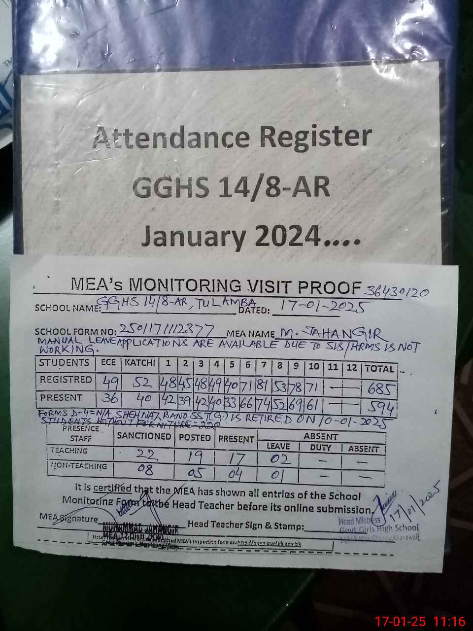 | Attendance Register | Head Teacher | MEA with School | Visit Proof |