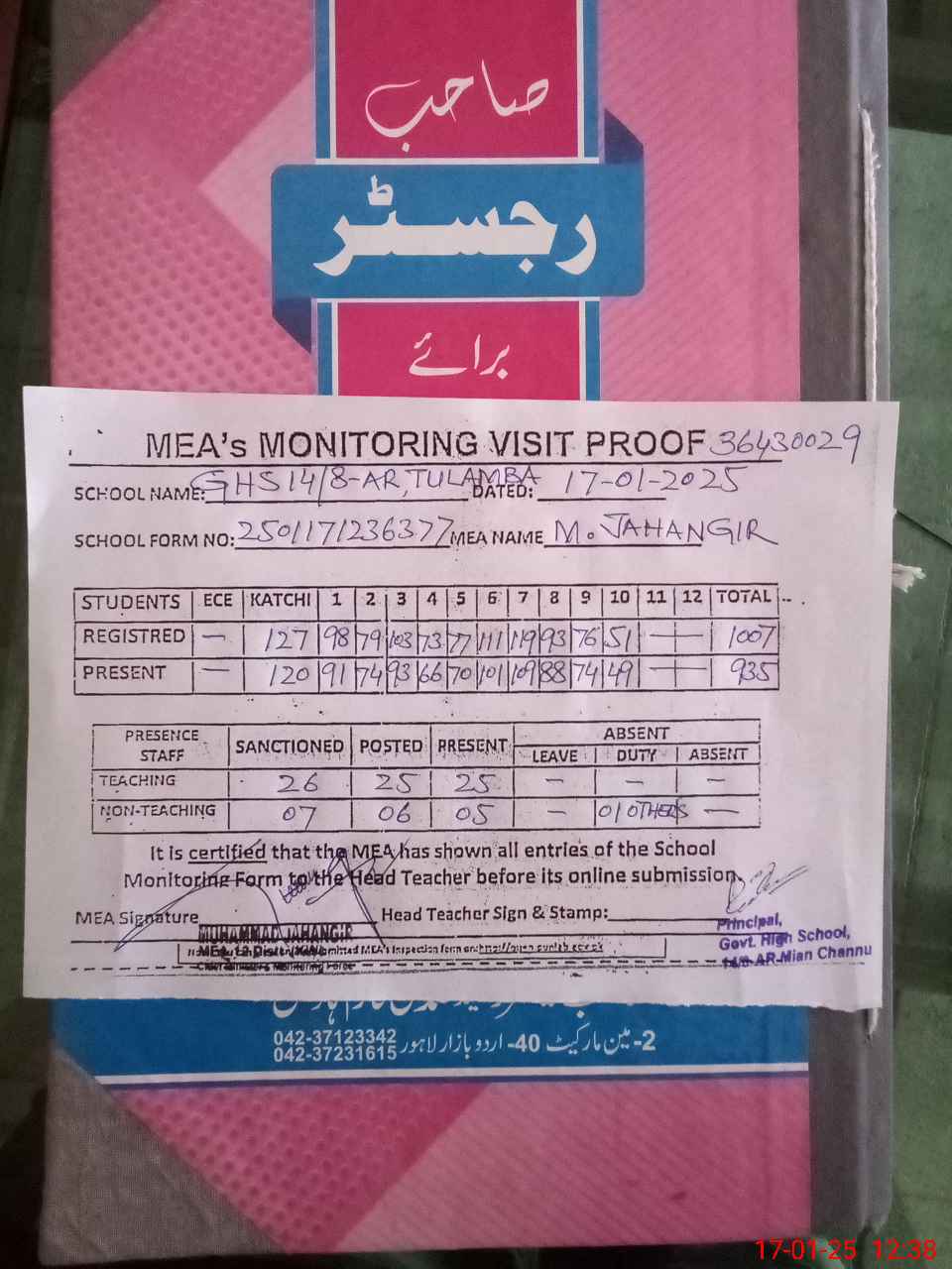 | EMIS Code: 36430029 | Name of School: GHS 14/8-AR, TULAMBA | |||
