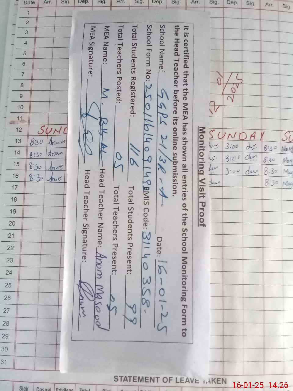 | Attendance Register | Head Teacher | MEA with School | Visit Proof |
