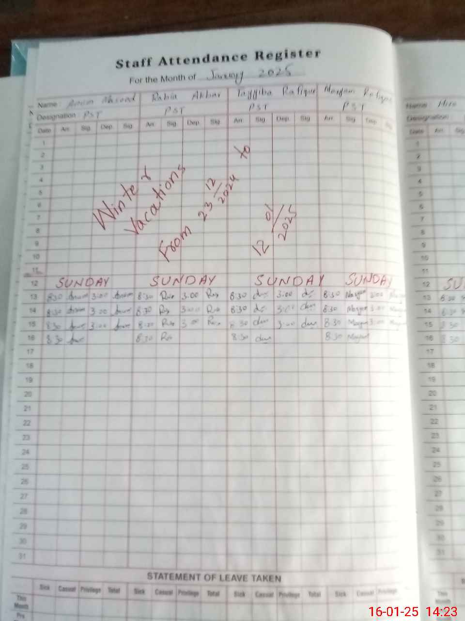 | Leave | Duty | Absent | Maternity | Medical | Ex- Pak |