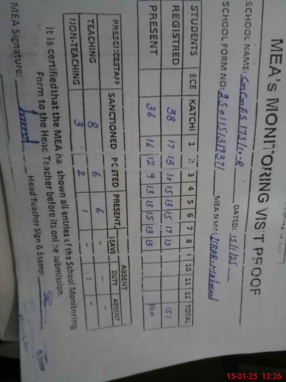 | Attendance Register | Head Teacher | MEA with School | Visit Proof |