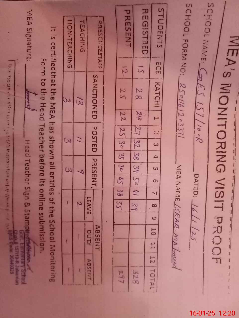 | Attendance Register | Head Teacher | MEA with School | Visit Proof |