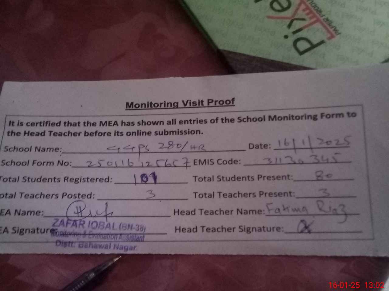| EMIS Code: 31130345 | Name of School: GGPS CHAK NO 280 HR | |||