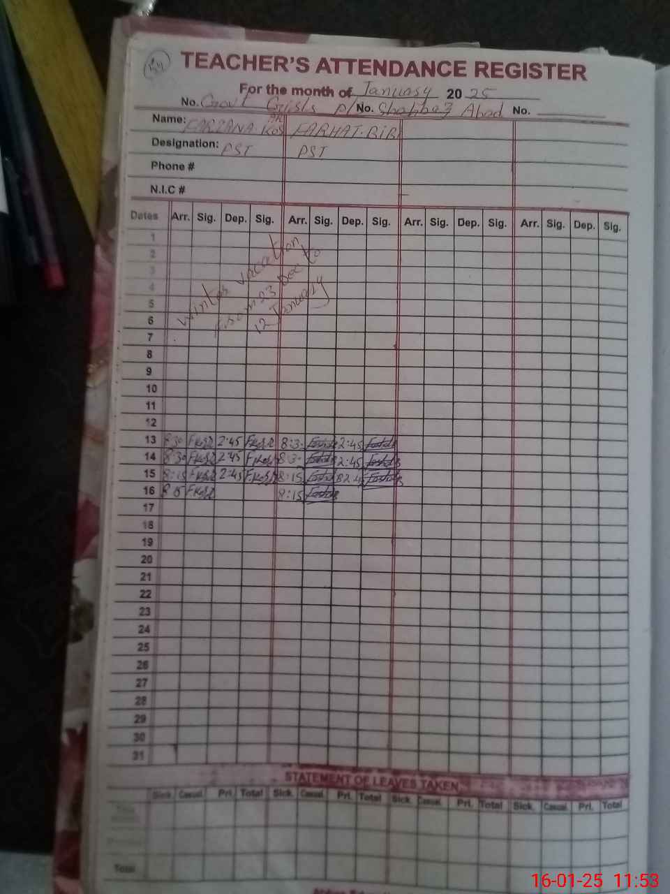 | CNIC | Full Name | Designation | R/C | Absence During Last Calender Month |