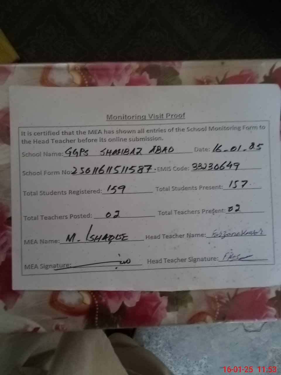 | EMIS Code: 33230649 | Name of School: GGPS SHAHBAZ ABAD | |||