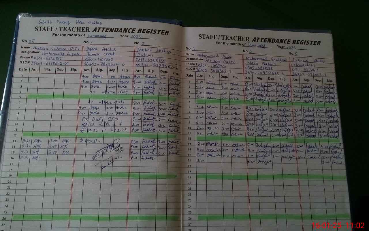 | CNIC | Full Name | Designation | R/C | Absence During Last Calender Month |