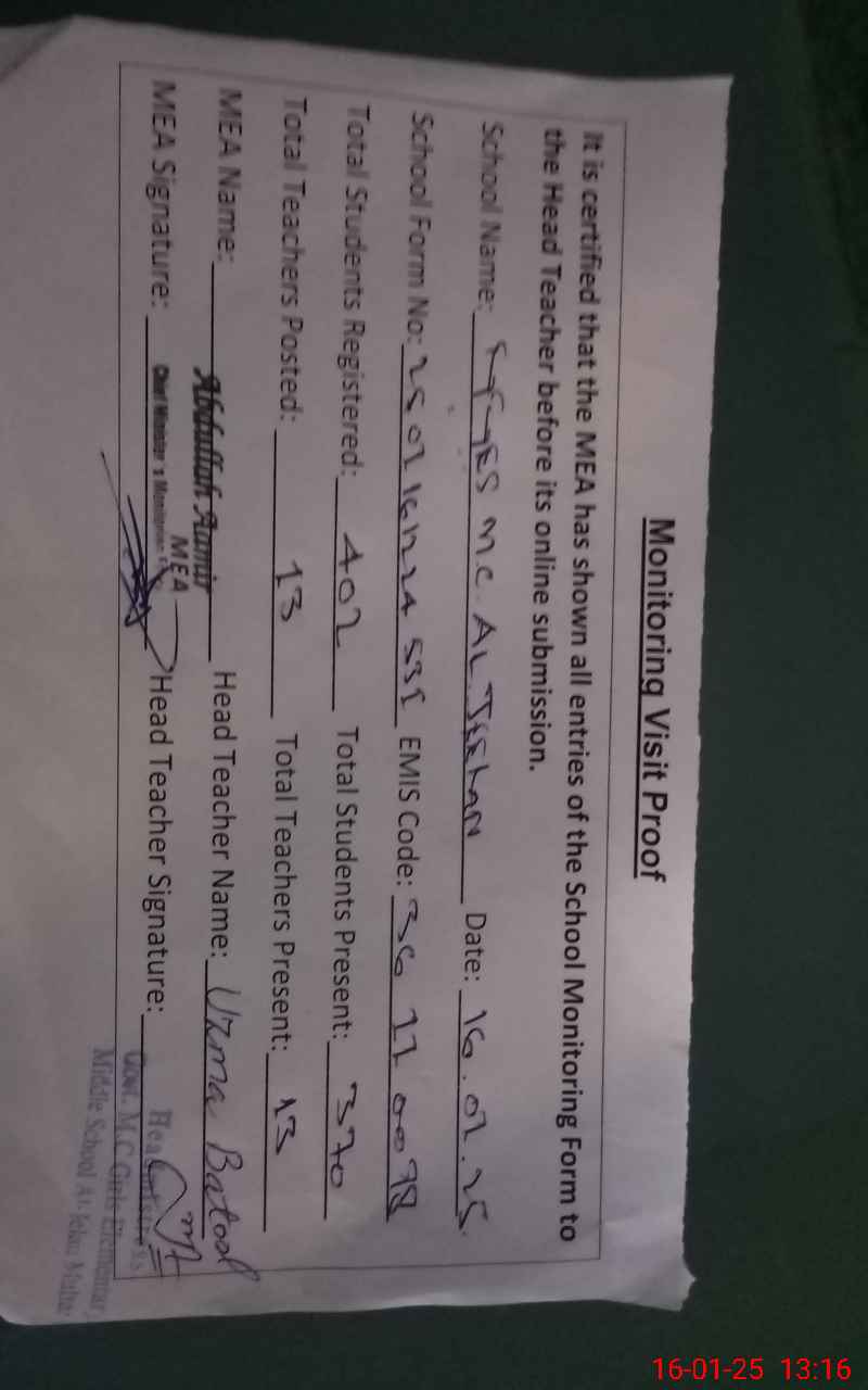 | EMIS Code: 36110098 | Name of School: GGES MC AL-JEELAN MULTAN | |||