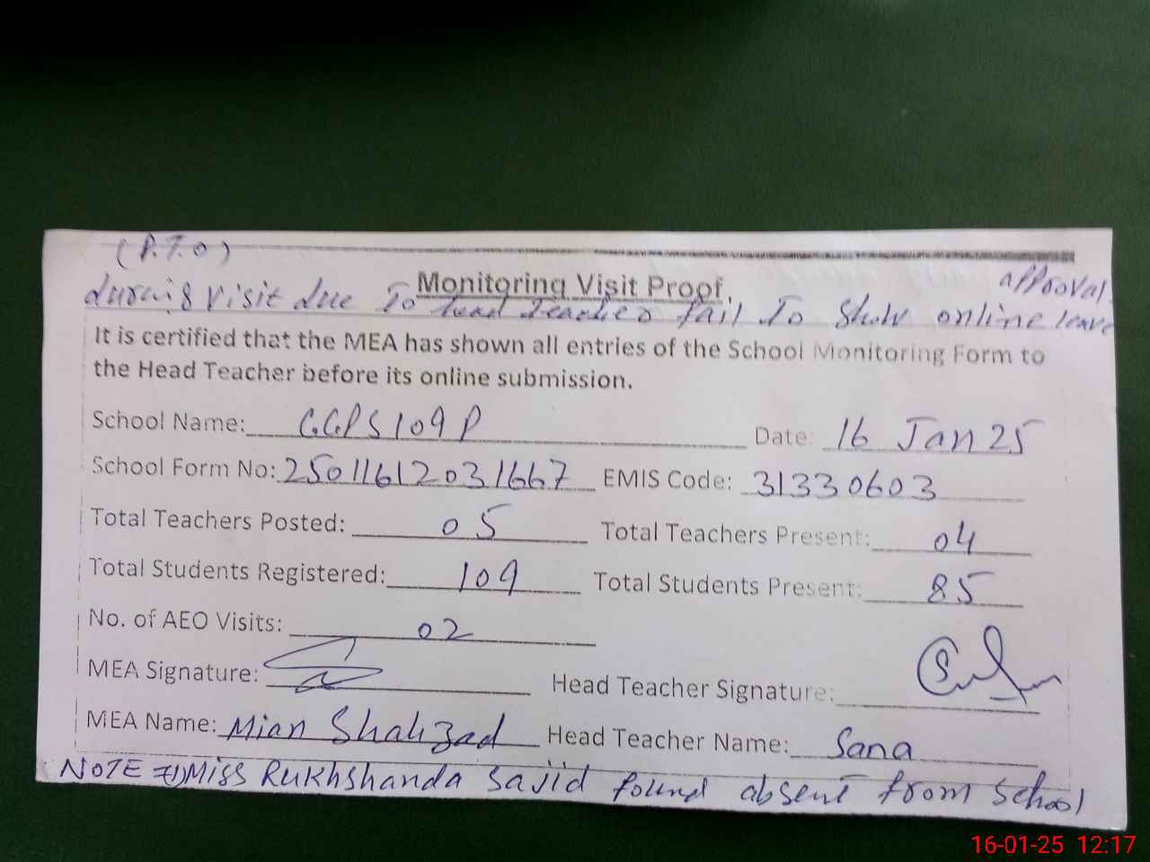 | Remarks (Use Separate Page if Required): 1 Miss Rukhshanda Sajid found absent from school during visit due to head teacher fail to show online leave approval 2 Daily attendance of teachers and students is not marked on SIS due to internet issue | |||||