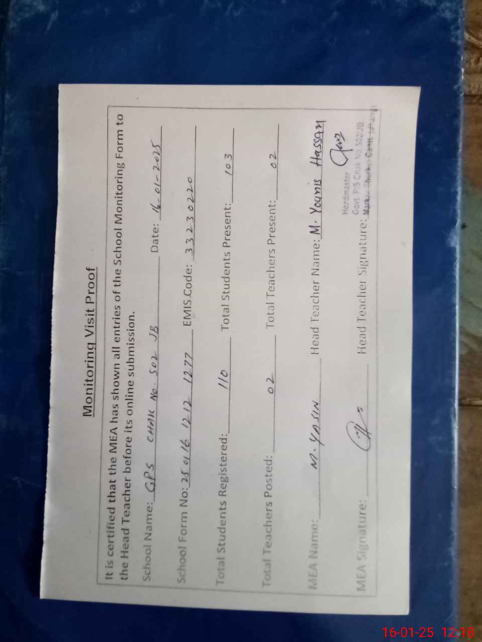 | EMIS Code: 33230220 | Name of School: GPS CHAK NO 502 JB | |||