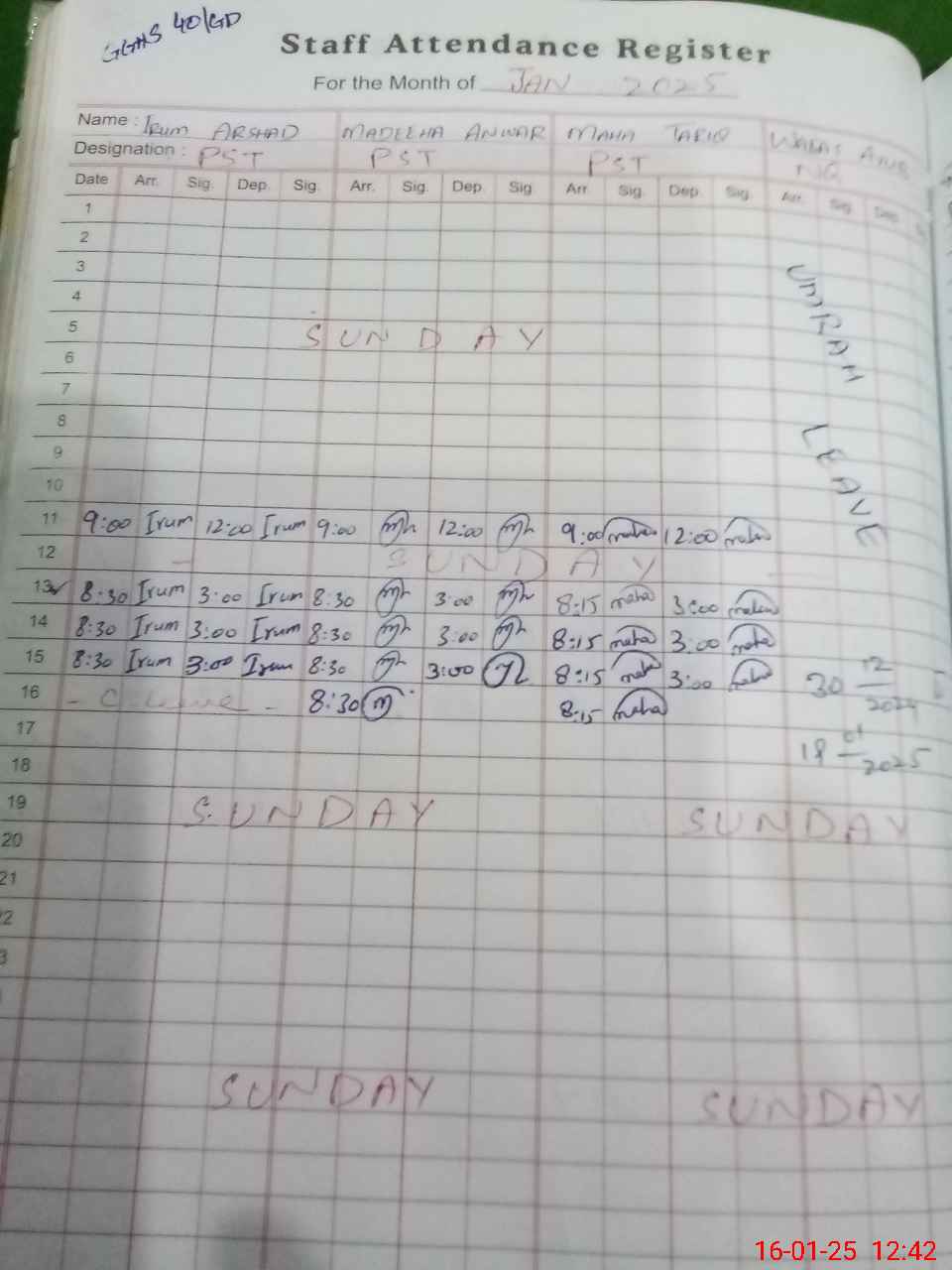 | Leave | Duty | Absent | Maternity | Medical | Ex- Pak |
