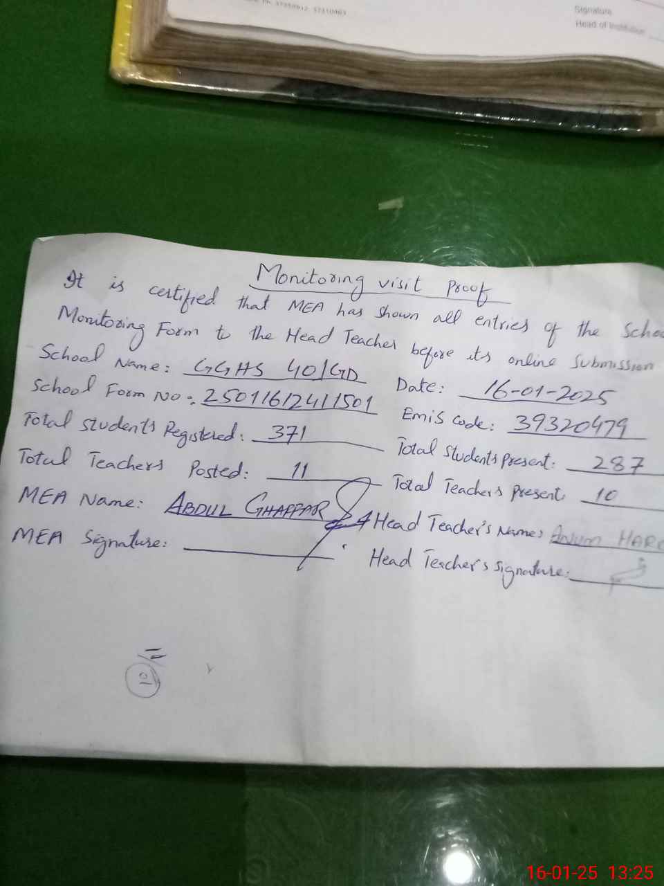 | Attendance Register | Head Teacher | MEA with School | Visit Proof |