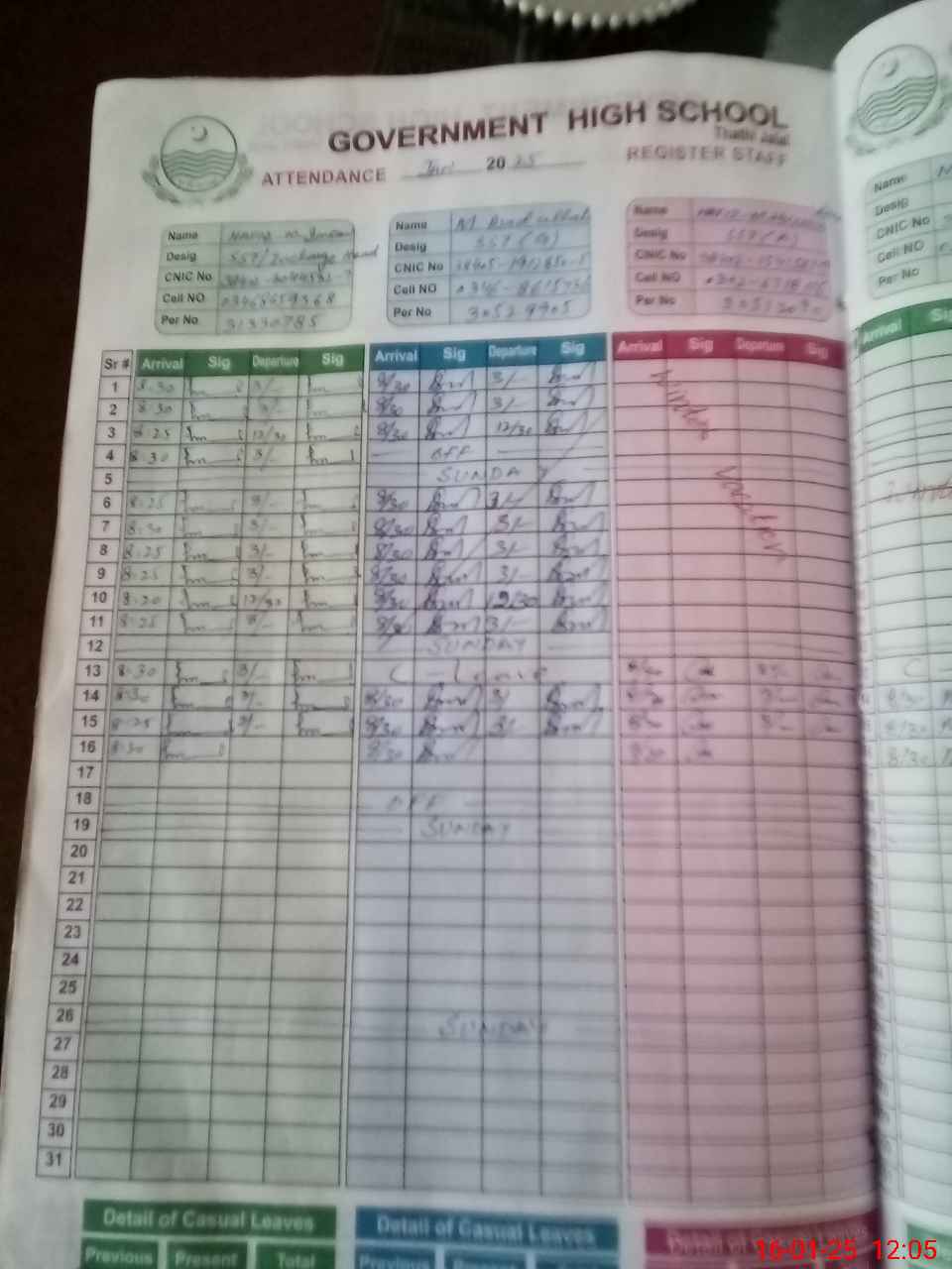 | CNIC | Full Name | Designation | R/C | Absence during last cal. month |