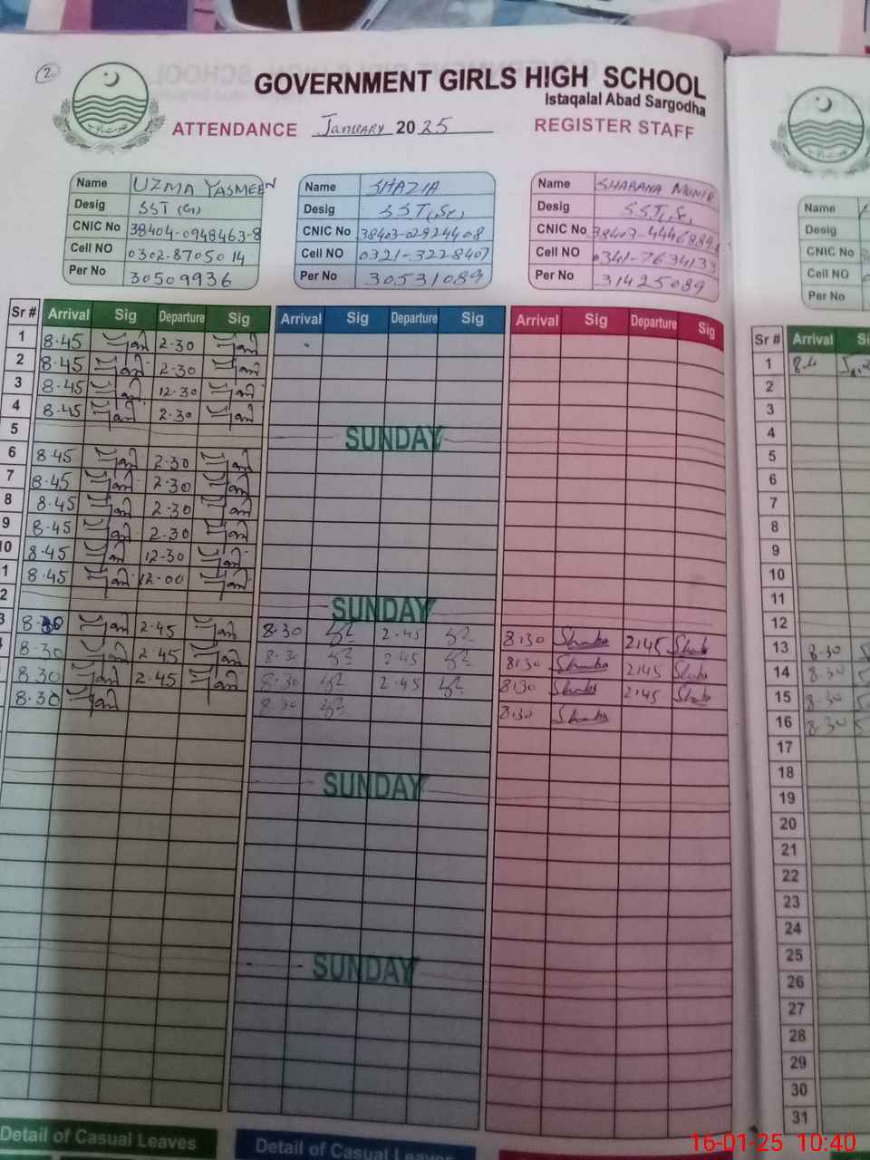 | CNIC | Full Name | Designation | R/C | Absence during last cal. month |