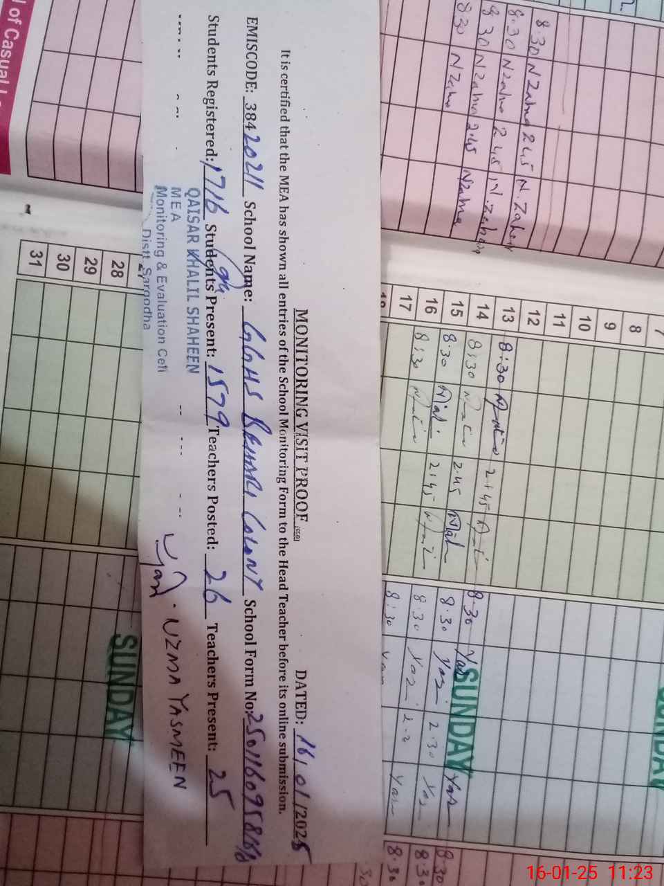 | Name: Uz**** Ya**** Designation: (School Headmaster's/Headmistress's) SST ARTS Phone/Cell Number: 03**** |