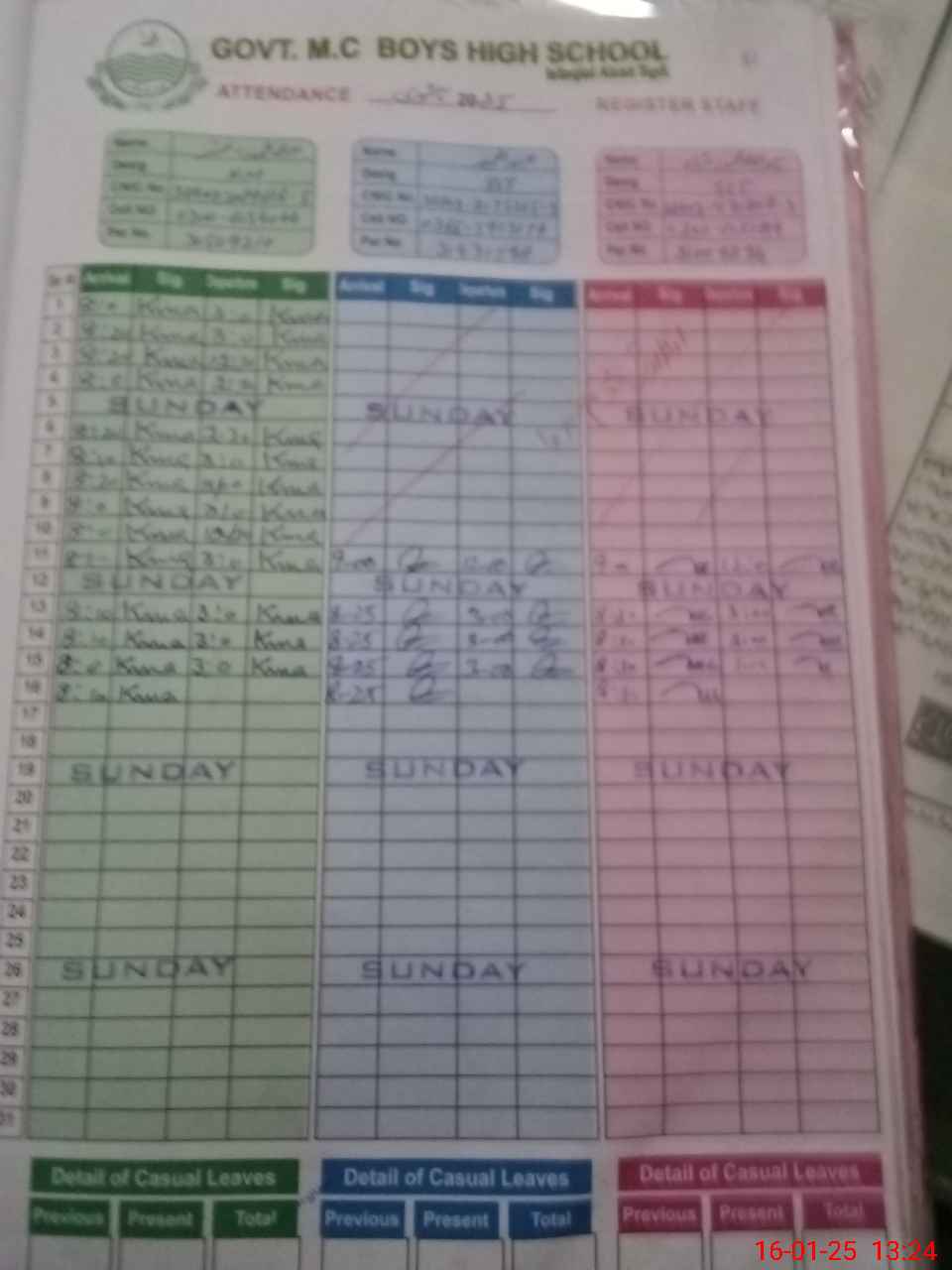 | CNIC | Full Name | Designation | R/C | Absence During Last Calender Month |