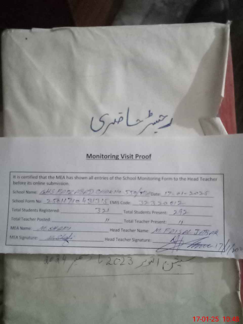 | Attendance Register | Head Teacher | MEA with School | Visit Proof |