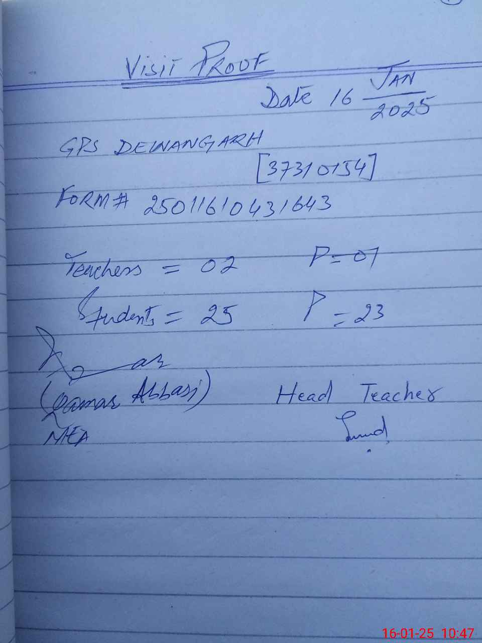 | Attendance Register | Head Teacher | MEA with School | Visit Proof |